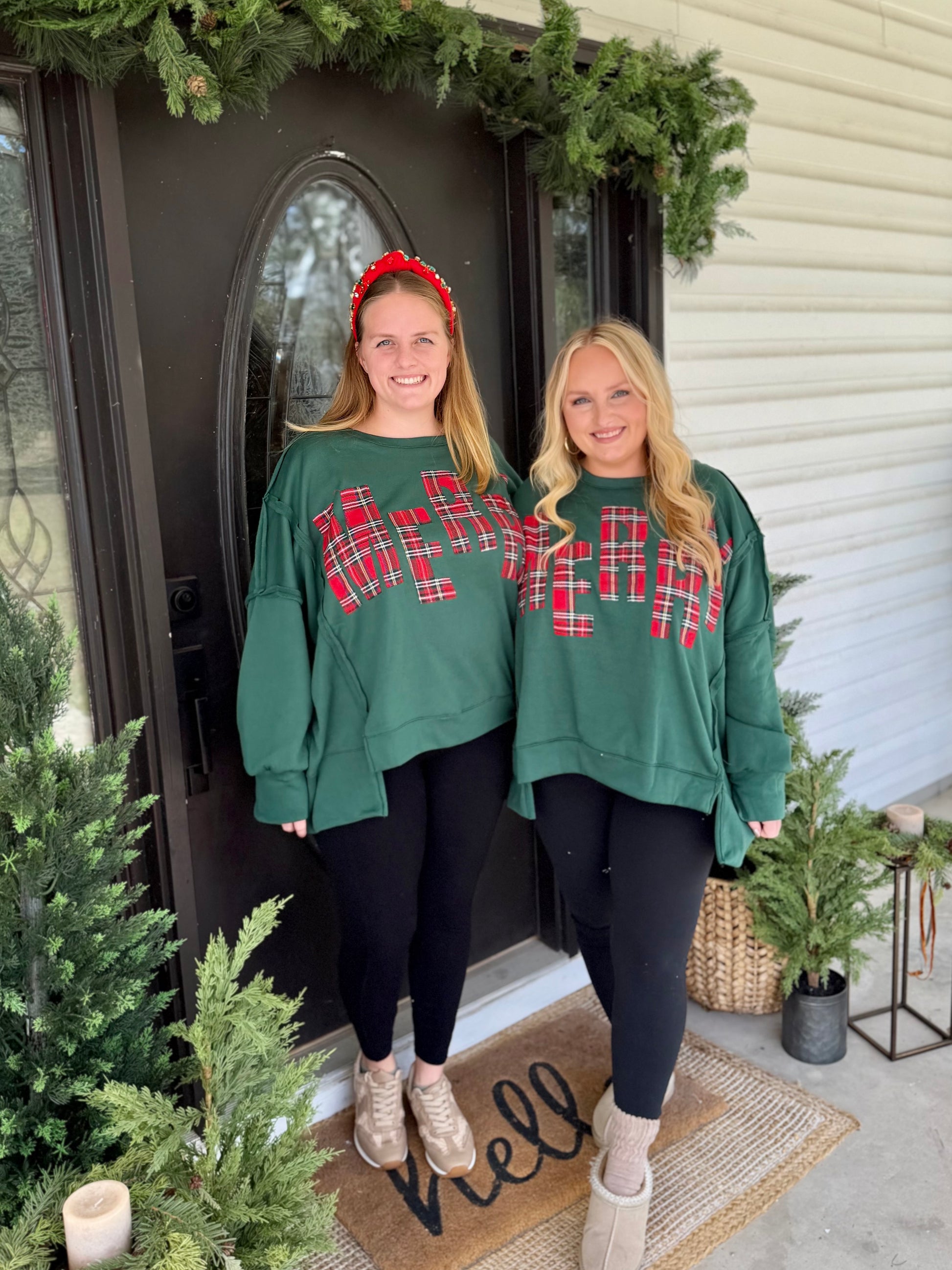 CHRISTMAS PLAID MERRY LETTERING CUT EDGE DETAILOVERSIZED FLEECE SWEATSHIRT